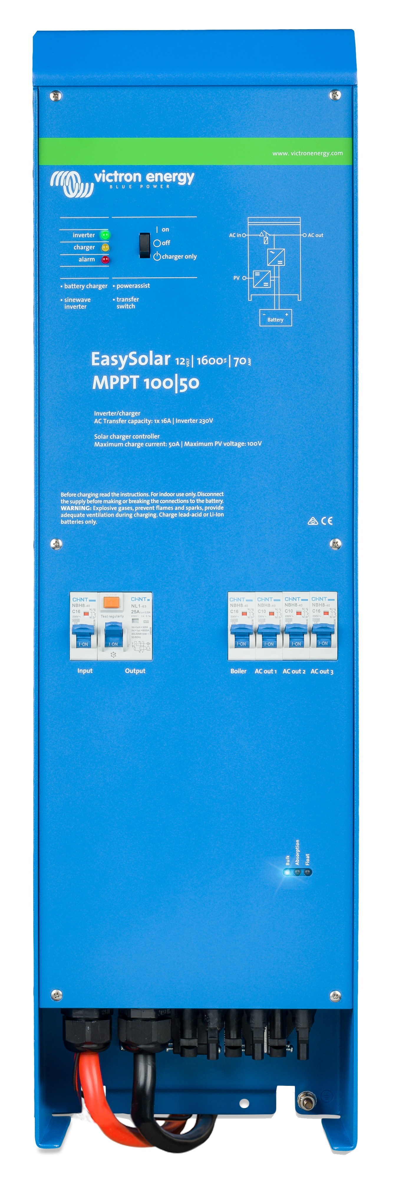 The EasySolar combines a MPPT Solar Charge Controller, an inverter/charger and AC distribution in one enclosure. The product is easy to install, with a minimum of wiring.